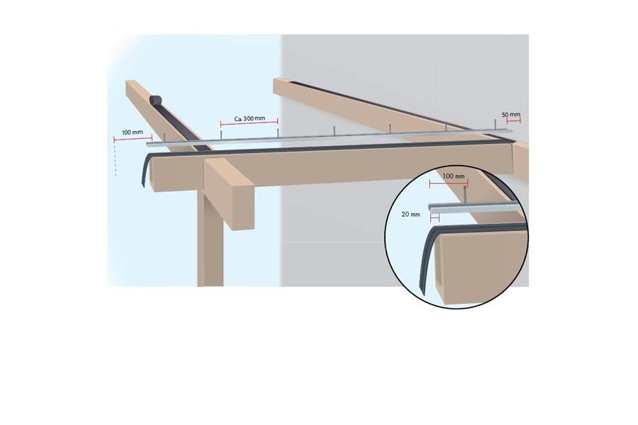 Alu-klipseskinnen bruges som bundprofil til at holde kanalpladerne fast ved montering på spær. Alu-klipseskinnen monteres ovenpå 58mm gummibund. Når kanalpladerne er placeret trykkes den hvide dækliste ned i klipseskinnen for at fastholde pladerne (brug gummihammer).