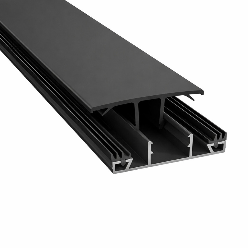 Sortlakeret aluminiums midterprofil med afdækning af slidstærkt plast og formonteret gummiliste.