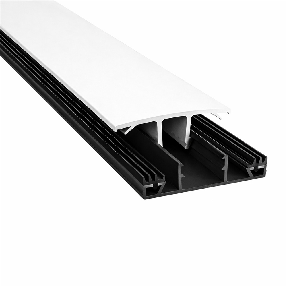 Lakeret aluminiums midterprofil med afdækning af slidstærkt plast og formonteret gummiliste. Med sort bund og hvid top, hvis denne æstetik passer bedst til dit projekt.